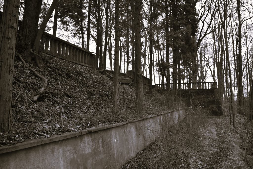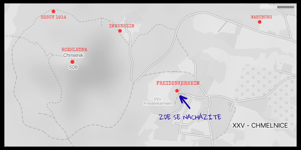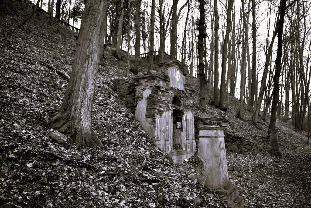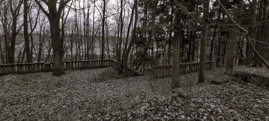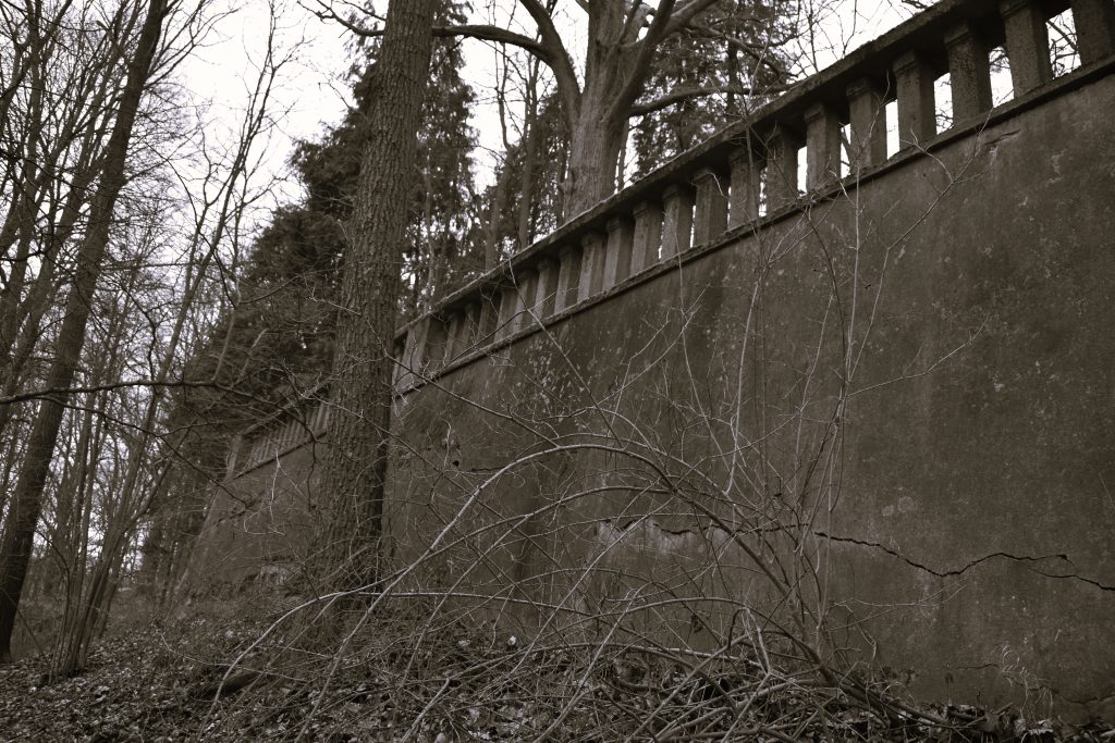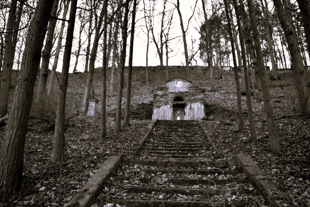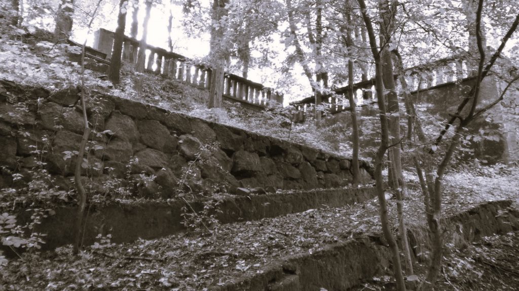 Zbytky areálu : torso mausolea a teras objevíte na zalesněném vršku nad děčínskou částí Chmelnice.
