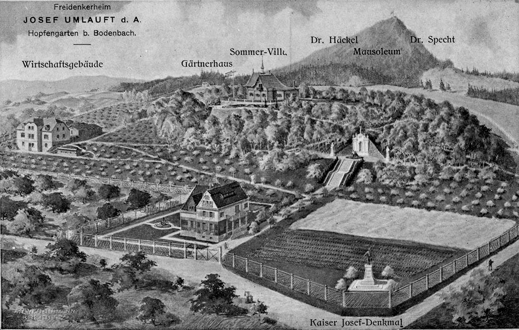 Součástí Freidenkerheimu, v rozlehlé zahradě se stovkami ovocných stromů, bylo i mauzoleum, vedle něhož stávaly busty předních představitelů volnomyšlenkářského hnutí Dr. Augusta Spechta a Dr. Ernsta Haeckela. Také cesty nesly jména učenců. V době největšího rozmachu se tu scházeli především duchovní přátelé filozoficky zaměřeného Umlaufta, kde společně šířili “Svobodné myšlení” prostřednictvím meditací, přednášek, rozprav a distribucí tištěných materiálů.