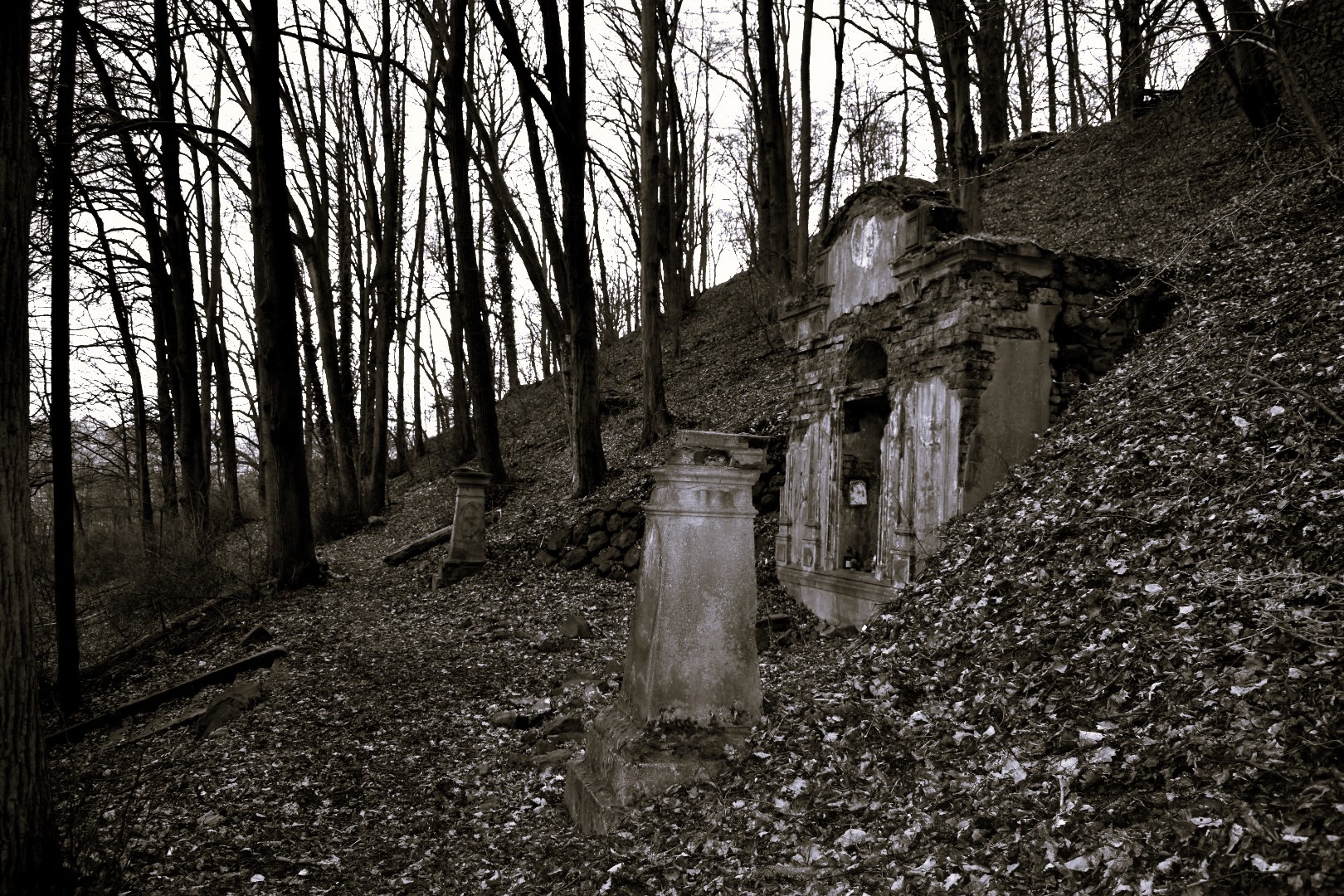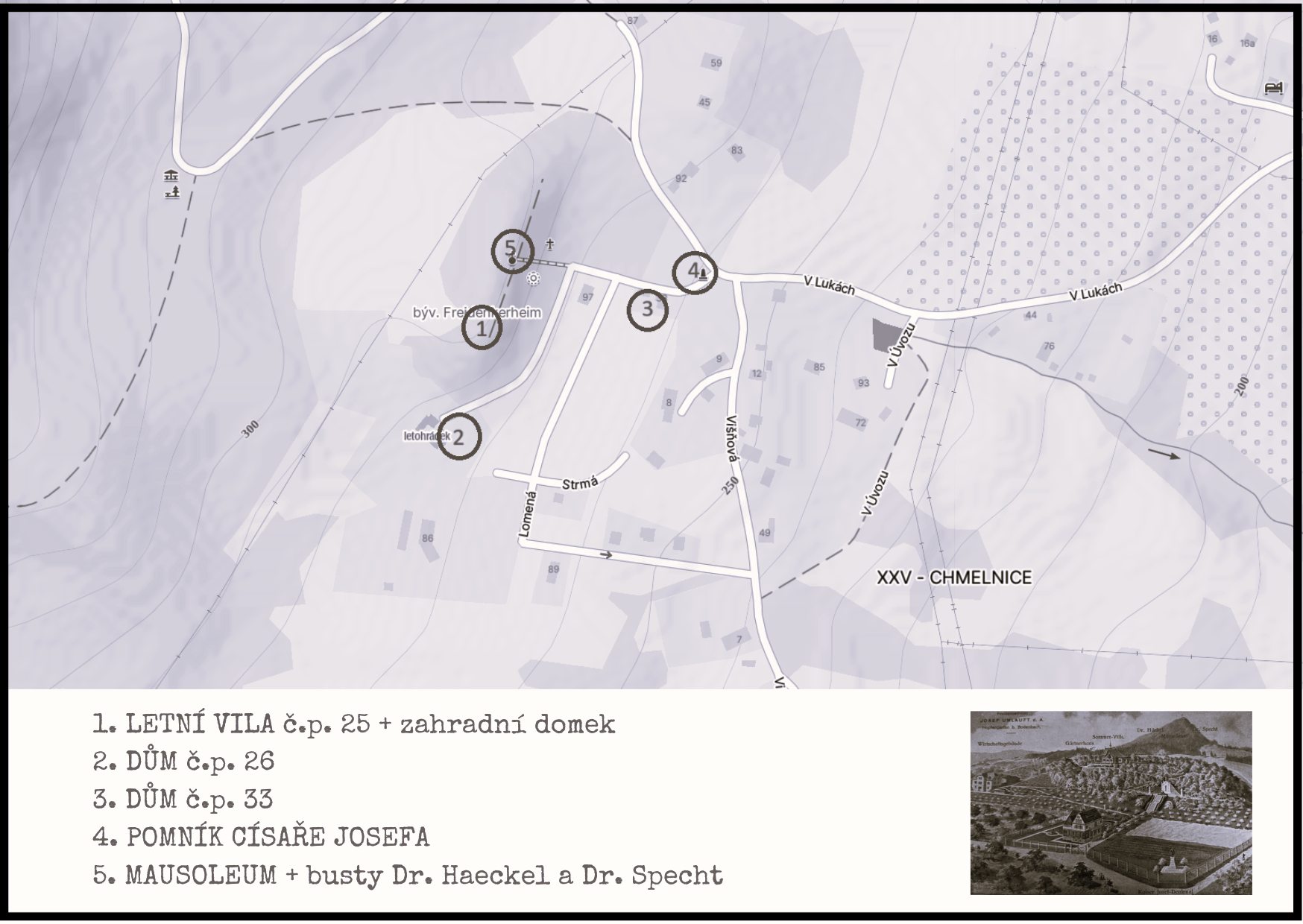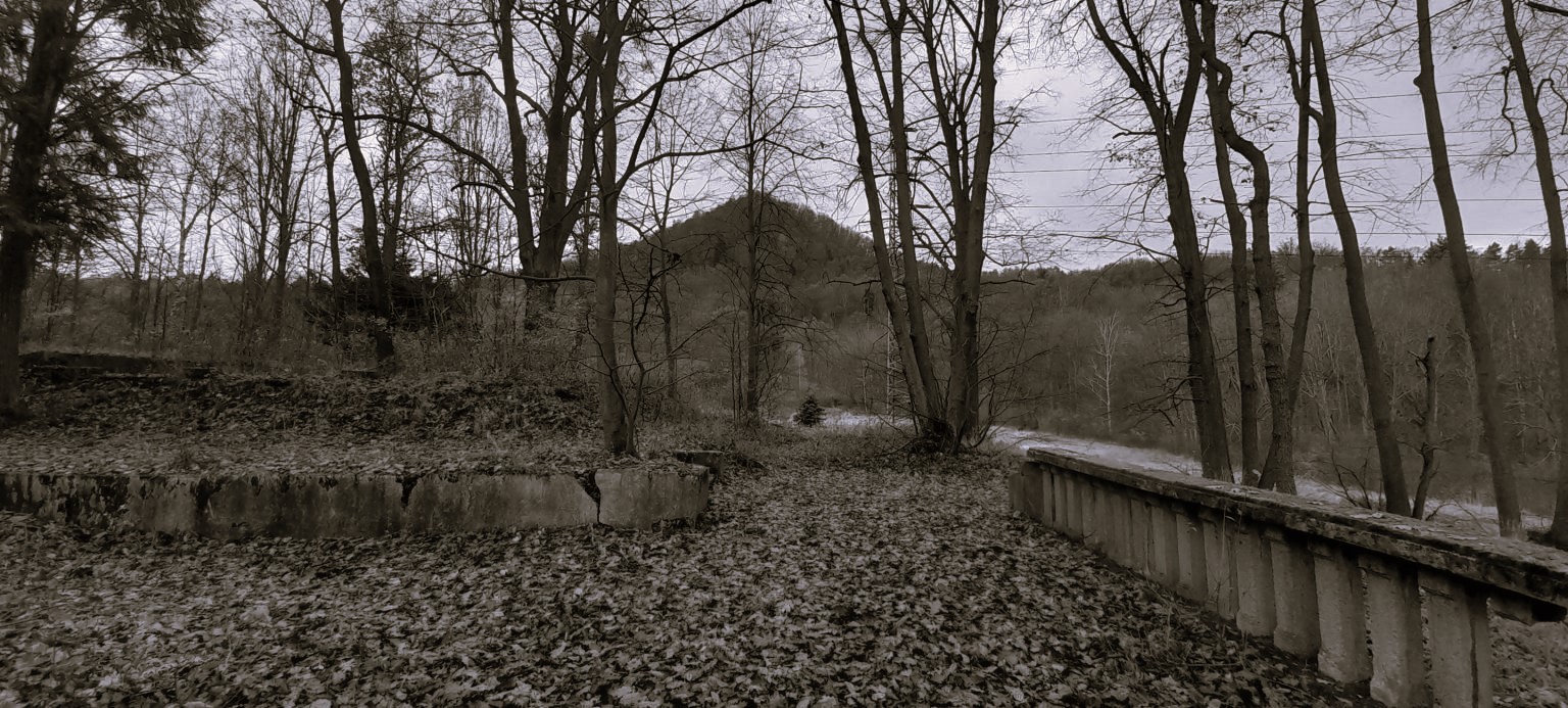 Zbytky areálu : torso mausolea a teras objevíte na zalesněném vršku nad děčínskou částí Chmelnice.
