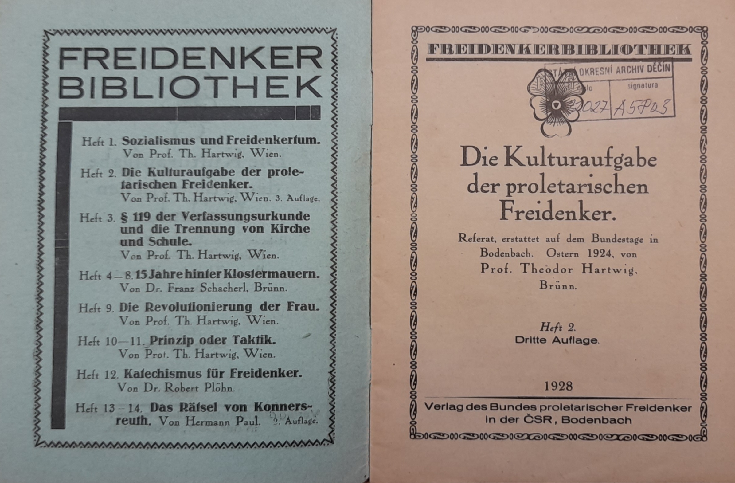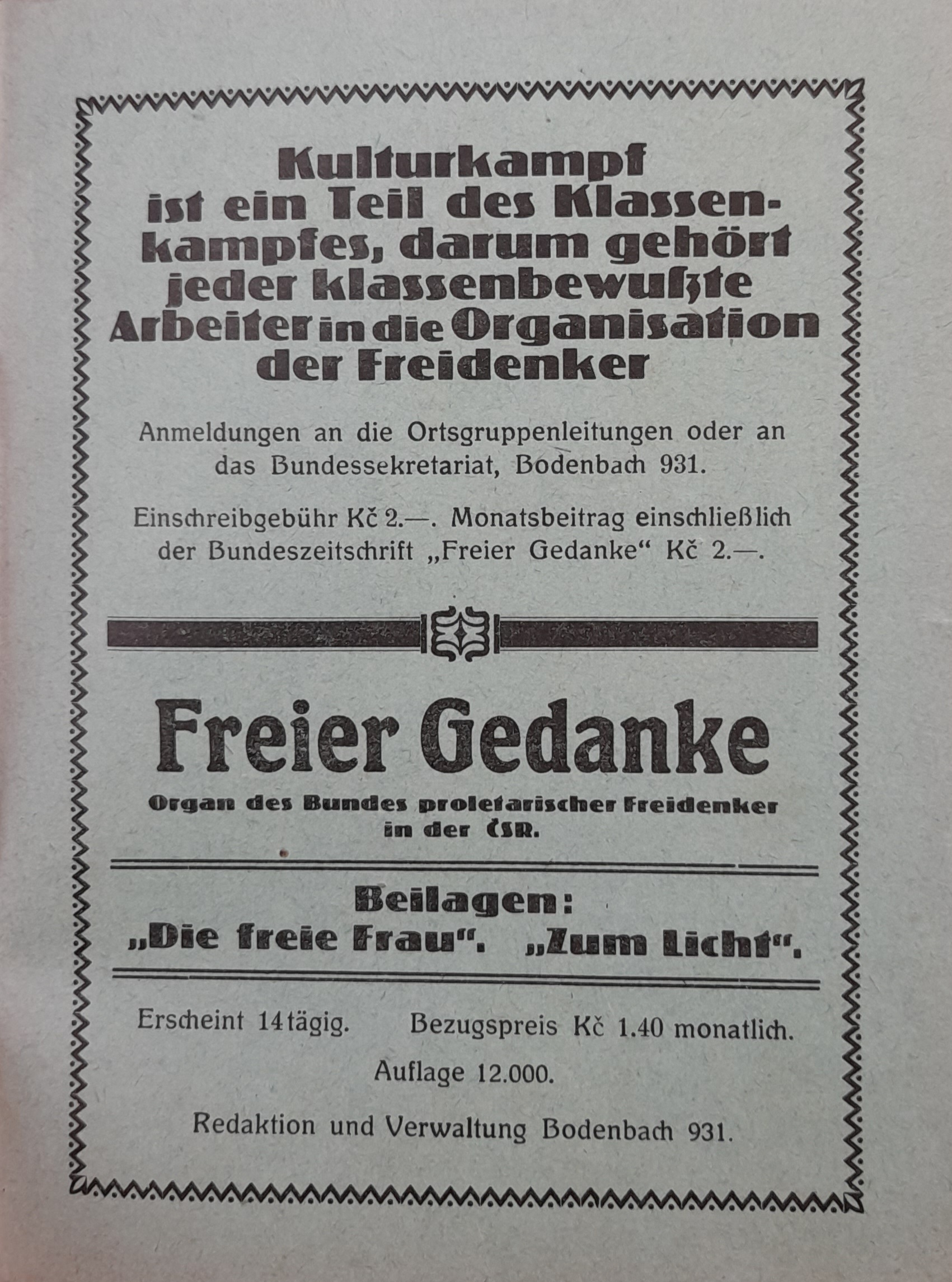 Od roku 1923 byly Podmokly sídlem ústřední federace volnomyšlenkářů v republice. Vycházely zde ústřední kalendáře, tiskopisy a brožury “Volná myšlenka”(Freier Gedanke) v nákladu 12000 výtisků jednou za 14 dní. Hlavní představitelé monistického vidění světa byli např. Dr. A. Specht , Dr. E. Haeckel nebo Putmann-Gotha a další. Tito muži byli též v kontaktu s podmokelským fabrikantem Josefem Umlauftem.